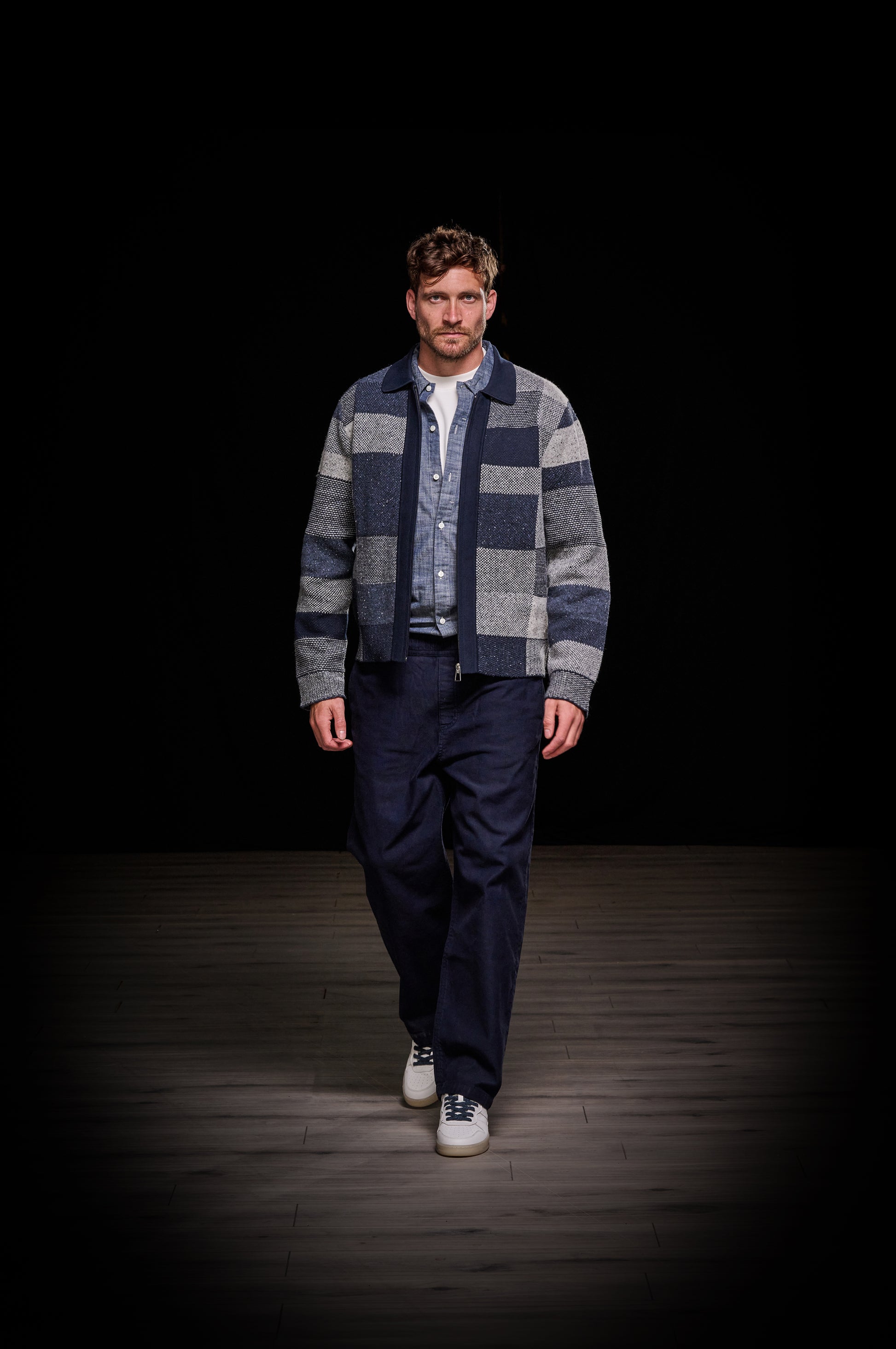 Navy Grey Tonal Patchwork Wool Blend Zip Through Cardigan