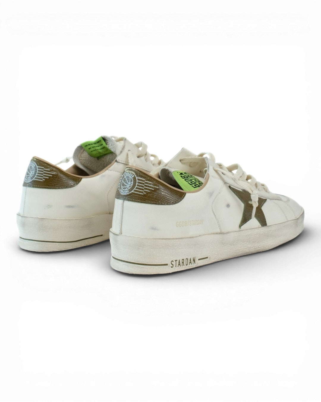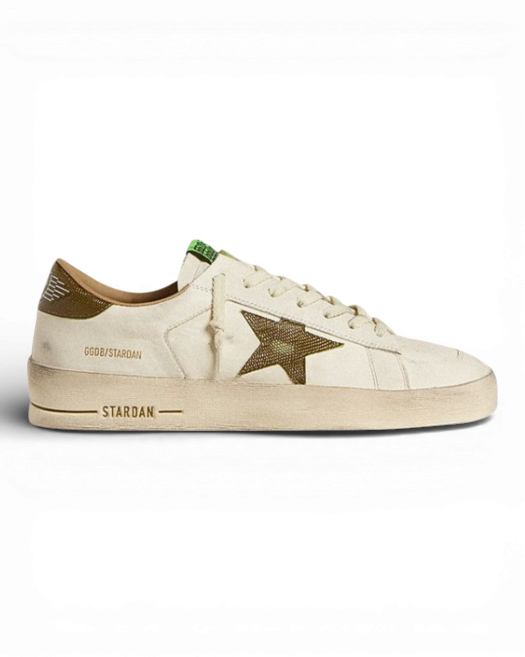 Golden Goose Stardan Leather Printed Star White / Green – een sneaker die de jaren ’90 basketbalstijl mixt met moderne luxe. Model GMF00667.F007555.10502 is gemaakt van zacht wit leer met een groene printed star en subtiele vintage afwerking. De Stardan staat bekend om zijn slanke, low-top silhouet dat strak rond de voet zit en een sportieve, maar toch elegante uitstraling heeft.