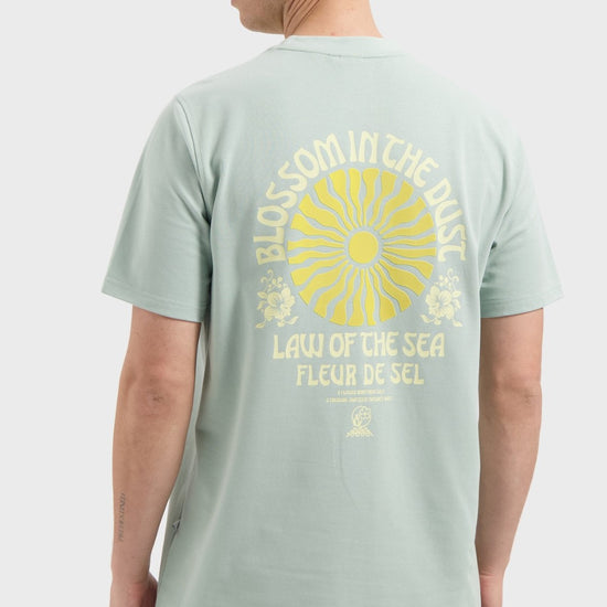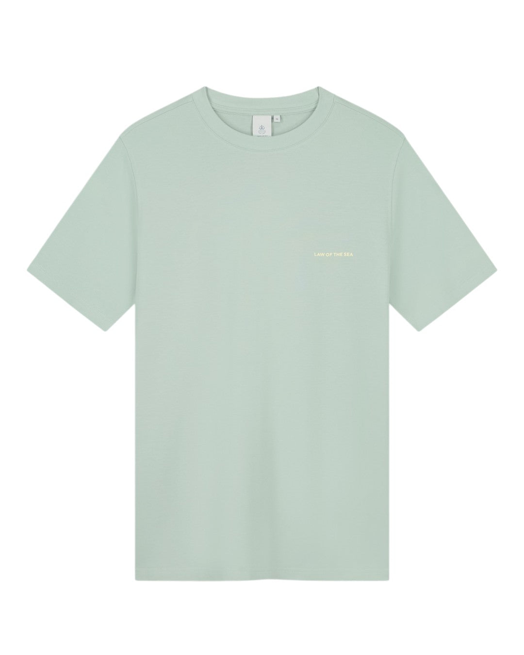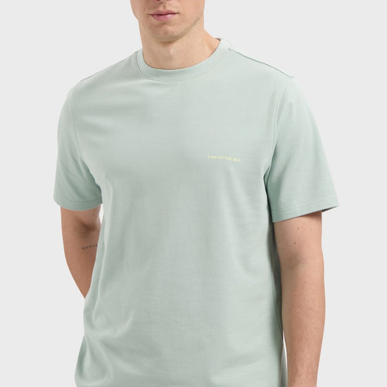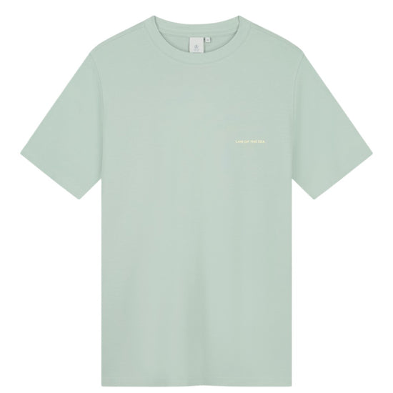 Rustig vooraan, karakter achteraan. Dit Law of the Sea T-shirt bij Checkpoint Mol combineert een zachte pastelgroene tint met een sterke backprint.