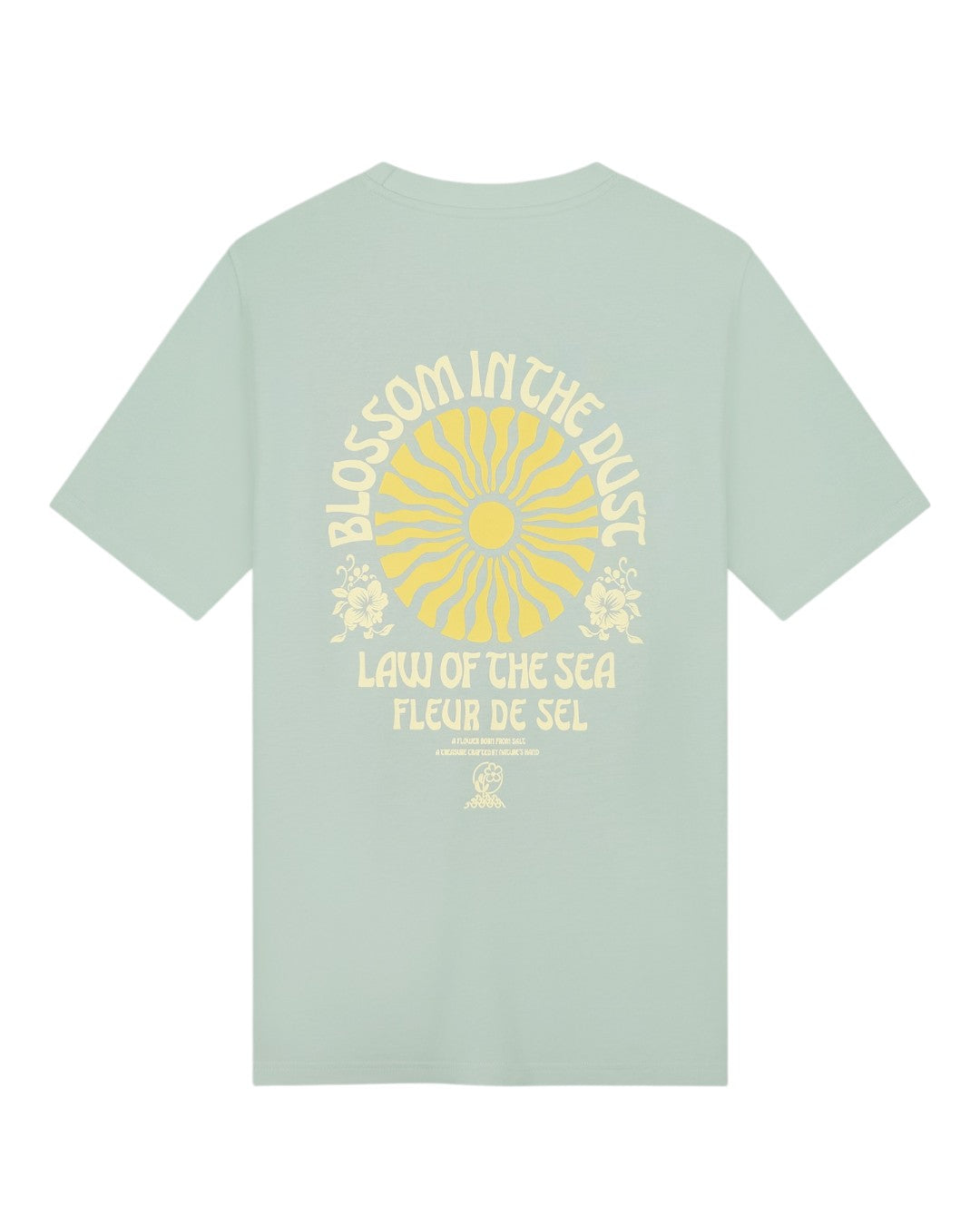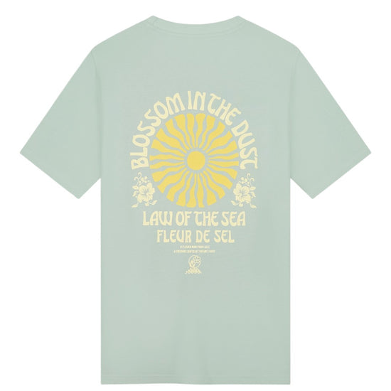 Dit T-shirt van Law of the Sea speelt met contrast: een cleane voorkant met subtiel artwork op de borst, en een uitgesproken artwork op de rug. De zachte jadegroene pasteltoon houdt het geheel fris en zomers, terwijl de print zorgt voor net dat extra karakter in je outfit.